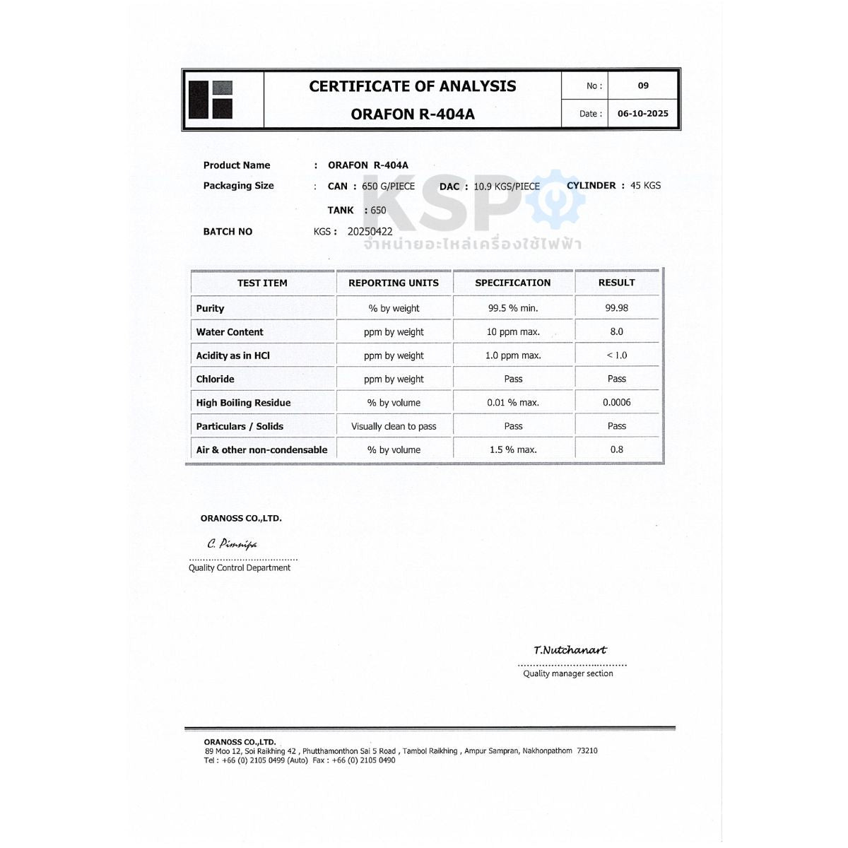 - ชนิดสินค้า: น้ำยาแอร์ R-404a