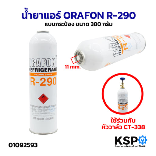 น้ำยาแอร์ ORAFON R290 แบบกระป๋อง ขนาด 380 กรัม เป็นสารทำความเย็นชนิดโพรเพน (Propane) ที่เหมาะสำหรับเครื่องปรับอากาศขนาดเล็ก ตู้เย็น และตู้แช่รุ่นใ...