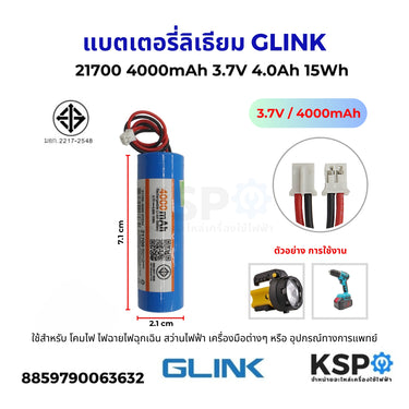 แบตเตอรี่ลิเธียม GLINK รุ่น 1P 21700 มาพร้อมกับความจุ 4000mAh และแรงดันไฟฟ้า 3.7V เหมาะสำหรับใช้งานในโคมโซล่าเซลล์ที่ต้องการประสิทธิภาพสูงและยาวนาน โดยมีกำลังไฟ 4.0Ah และพลังงาน 15Wh ให้แสงสว่างที่มั่นคงและต่อเนื่อง ทำให้เหมาะสำหรับการใช้งานทั้งในบ้านและภายนอก