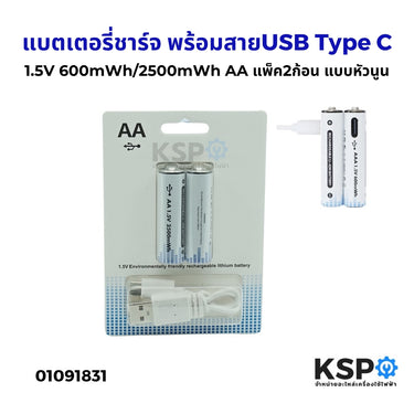 แบตเตอรี่ชาร์จ พร้อมสายUSB Type C 1.5V 600mWh/2500mWh AA/AAA แพ็ค2ก้อน แบบหัวนูน อุปกรณ์แบตเตอรี่