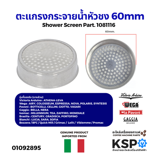 ตะแกรงกระจายน้ำหัวชง ขนาด 60mm รุ่น Part No. 1081116 (แท้) สำหรับเครื่องชงกาแฟแบรนด์ชั้นนำ เช่น Victoria Arduino, Wega, Pavoni, Gaggia, Isomac, Bra...