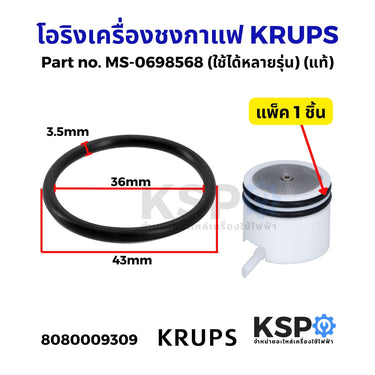 ซีลยาง โอริง เครื่องชงกาแฟ KRUPS (Piston Seal O-ring) Part No. MS-0698568 ของแท้นำเข้าจากอิตาลี ขนาด 43x36x3.5 มม. ใช้กับเครื่องชงกาแฟ KRUPS หลายรุ่น รวมถึง EA817010, EA819E, EA891810, EA894T และรุ่นอื่นๆ อีกกว่า 100 รุ่น ช่วยป้องกันการรั่วซึมและรักษาแรงดันในการสกัดกาแฟให้สม่ำเสมอ