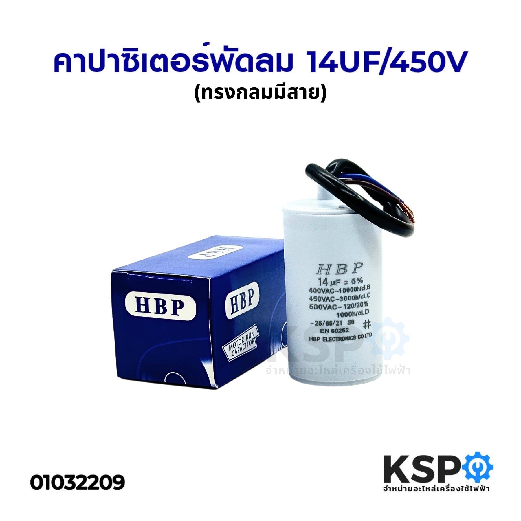 คาปาซิเตอร์พัดลม 14UF/450V (ทรงกลมมีสาย) อะไหล่พัดลม