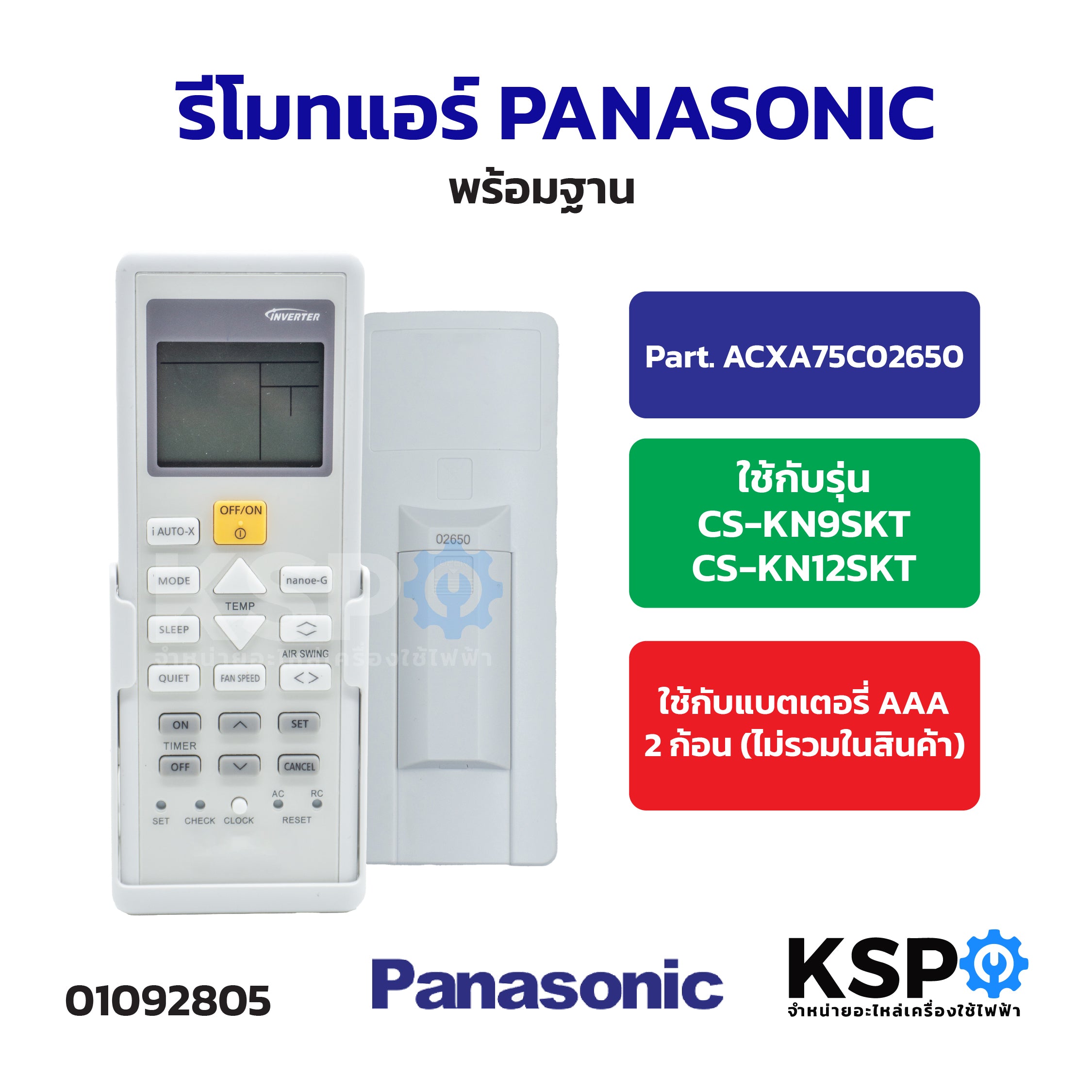 รีโมทแอร์ PANASONIC พานาโซนิค พร้อมฐาน Part. ACXA75C02650 รุ่น CS-KN9SKT, CS-KN12SKT อะไหล่แอร์