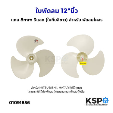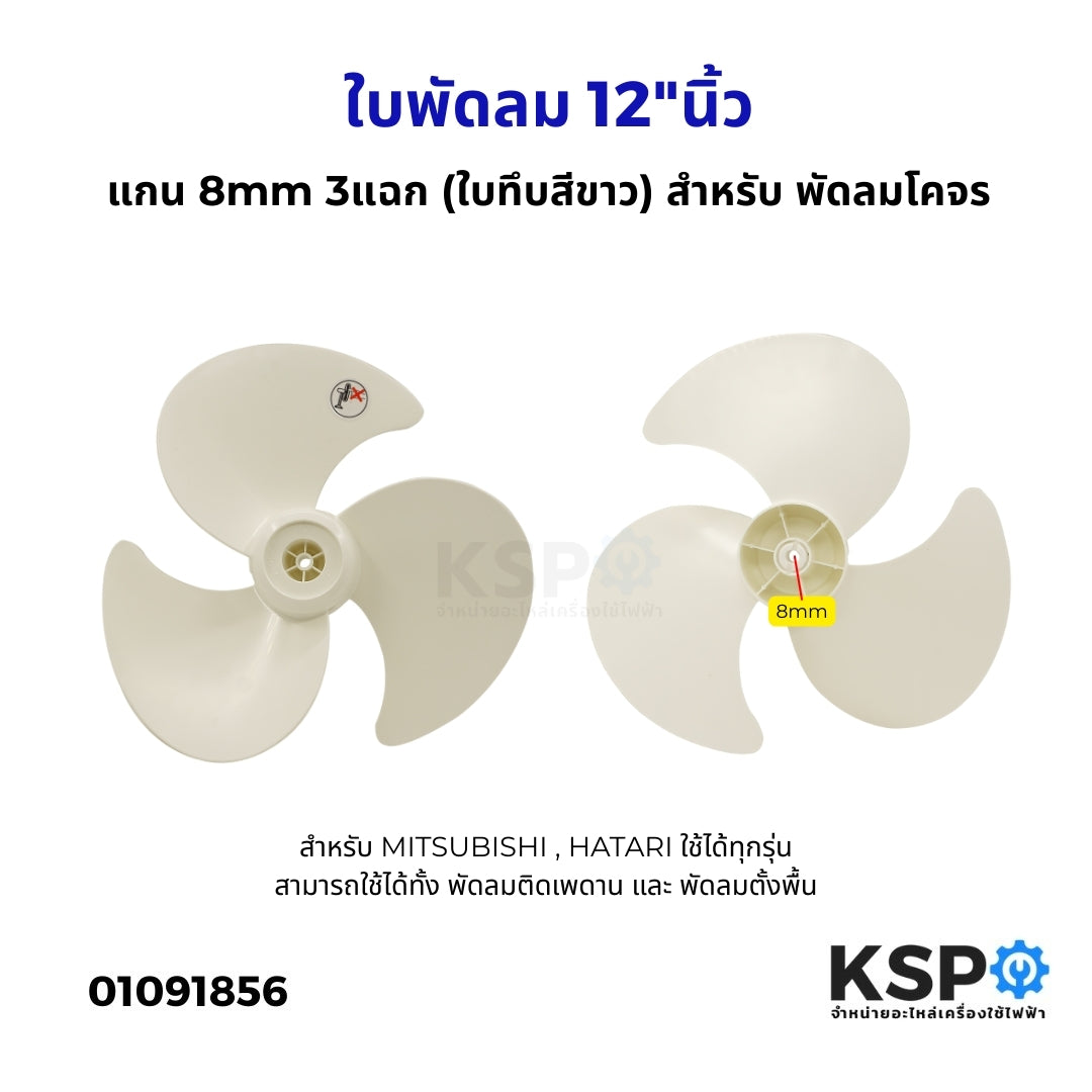 ใบพัดลม 12"นิ้ว แกน 8mm 3แฉก (ใบทึบสีขาว) พัดลมโคจร สำหรับ MITSUBISHI , HATARI ใช้ได้ทุกรุ่น อะไหล่พัดลม