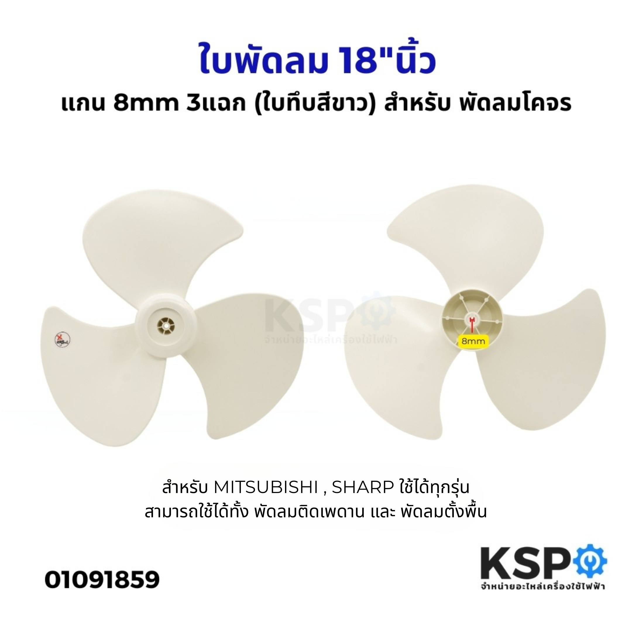 ใบพัดลม 18"นิ้ว แกน 8mm 3แฉก (ใบทึบสีขาว) พัดลมโคจร สำหรับ MITSUBISHI , SHARP ใช้ได้ทุกรุ่น อะไหล่พัดลม