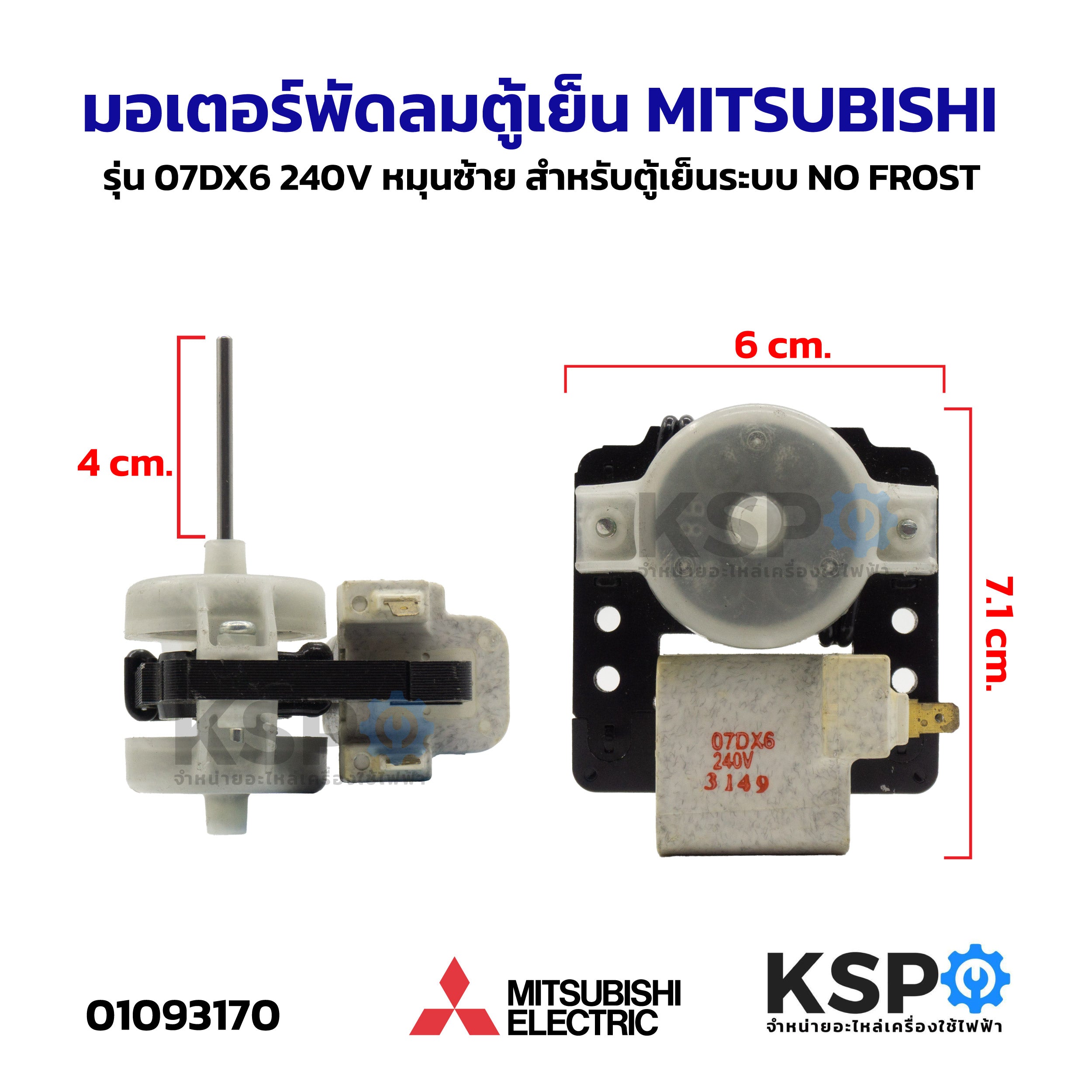 มอเตอร์พัดลมตู้เย็น MITSUBISHI มิตซูบิชิ รุ่น 07DX6 240V หมุนซ้าย สำหรับตู้เย็นระบบ NO FROST อะไหล่ตู้เย็น