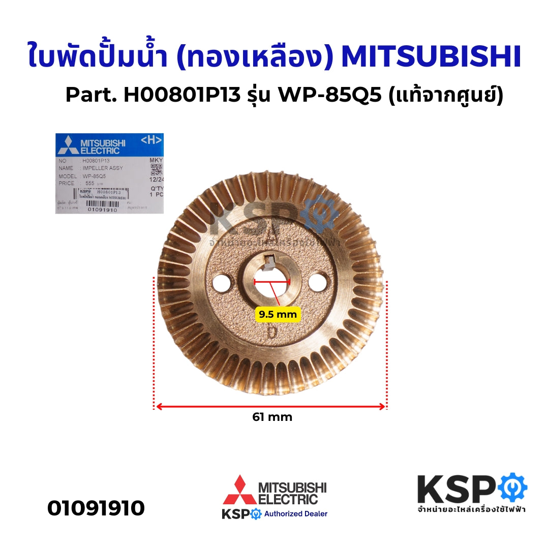 ใบพัดปั้มน้ำ (ทองเหลือง) MITSUBISHI มิตซูบิชิ Part. H00801P13 รุ่น WP-85Q5 (แท้จากศูนย์) อะไหล่ปั๊มน้ำ