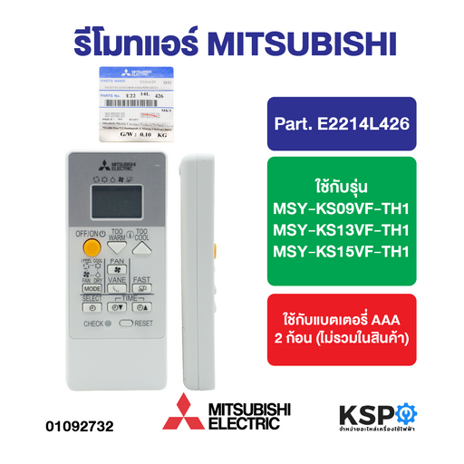 รีโมทแอร์ MITSUBISHI มิตซูบิชิ Part. E2214L426 รุ่น MSY-KS09VF-TH1, MSY-KS13VF-TH1, MSY-KS15VF-TH1 อะไหล่ทดแทนที่จำเป็นสำหรับการซ่อมแซมเครื่องปรับอ...