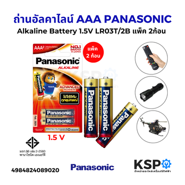 ถ่านอัลคาไลน์ Panasonic ขนาด AAA แรงดัน 1.5 โวลต์ รุ่น LR03T/2B แพ็ค 2 ก้อน ให้พลังงานยาวนาน เหมาะสำหรับอุปกรณ์อิเล็กทรอนิกส์ทั่วไป เช่น รีโมทคอนโทรล ไฟฉาย เมาส์ไร้สาย ของเล่น และอื่นๆ