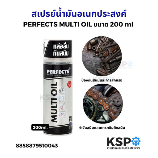 สเปรย์น้ำมันอเนกประสงค์ PERFECTS MULTI OIL ขนาด 200 ml สเปรย์หล่อลื่นคุณภาพสูง ที่ช่วยดูแลโลหะทุกชนิดให้ปราศจากสนิมและการสึกหลอ ใช้งานง่ายและปลอดภั...