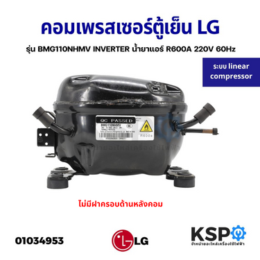 คอมตู้เย็น คอมเพรสเซอร์ตู้เย็น LG แอลจี ระบบ linear compressor รุ่น BMG110NHMV INVERTER น้ำยา R600A (ไม่มีฝาครอบด้านหลังคอม) อะไหล่ตู้เย็น