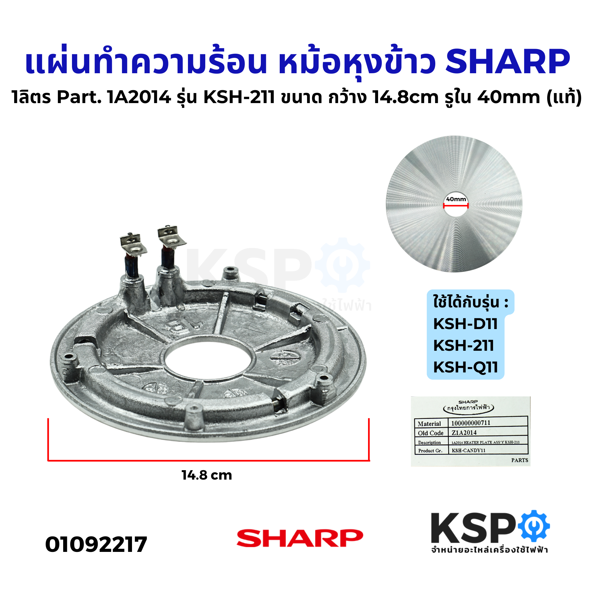 แผ่นทำความร้อน หม้อหุงข้าว SHARP ชาร์ป 1ลิตร Part. 1A2014 รุ่น KSH-211 KSH-D11 ขนาด กว้าง 14.8cm รูใน 40mm (แท้) อะไหล่หม้อหุงข้าว