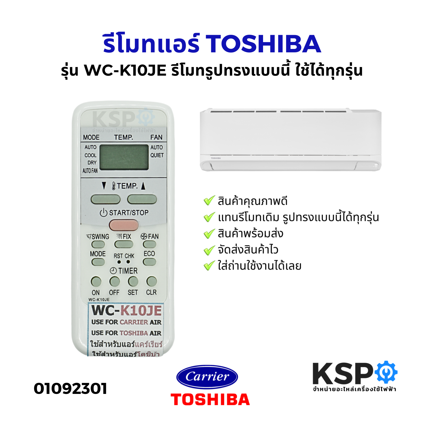 รีโมทแอร์ TOSHIBA โตชิบ้า CARRIER แคเรีย รุ่น WC-K10JE รีโมทรูปทรงแบบนี้ ใช้ได้ทุกรุ่น อะไหล่ทดแทนที่จำเป็นสำหรับการซ่อมแซมเครื่องปรับอากาศ TOSHIBA และ CARRIER ที่มีปัญหาด้านรีโมทควบคุม ช่วยให้เครื่องปรับอากาศของคุณกลับมาควบคุมได้อย่างปกติ รองรับการใช้งานได้ทั้งสองยี่ห้อ ใช้ได้ทุกรุ่นที่มีรูปทรงเดียวกัน