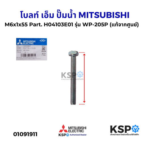โบลท์ เอ็ม ปั๊มน้ำ MITSUBISHI มิตซูบิชิ M6x1x55 Part. H04103E01 รุ่น WP-205P (แท้จากศูนย์) อะไหล่ปั๊มน้ำ