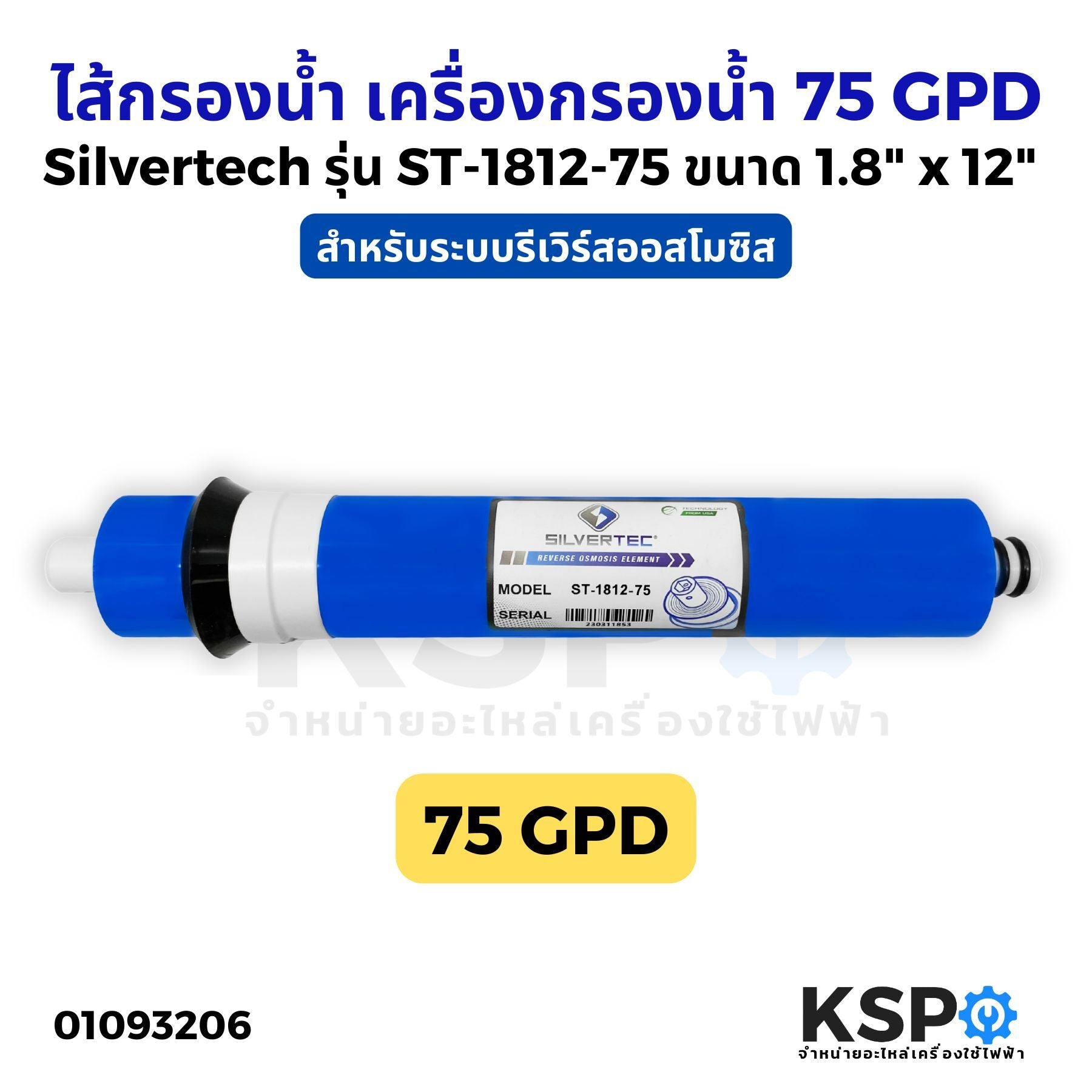 Silvertec ไส้กรองน้ำ ไส้กรองเมมเบรน RO เมมเบรน Membrane 75GPD รุ่น ST-1812-75 ขนาด 1.8" x 12" เครื่องกรองน้ำ ไส้กรอง RO อะไหล่เครื่องกรองน้ำคุณภาพสูงสำหรับการกรองน้ำด้วยระบบ Reverse Osmosis ช่วยกำจัดสารปนเปื้อน แร่ธาตุส่วนเกิน เชื้อโรค และสิ่งสกปรกต่างๆ ให้น้ำสะอาดบริสุทธิ์ ปลอดภัยต่อการดื่มและใช้งาน กรองได้ 75 แกลลอนต่อวัน เหมาะสำหรับใช้ในบ้าน สำนักงาน และร้านค้าขนาดกลาง