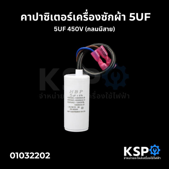 คาปาซิเตอร์ เครื่องซักผ้า 5UF 450V (กลมมีสาย) อะไหล่เครื่องซักผ้า