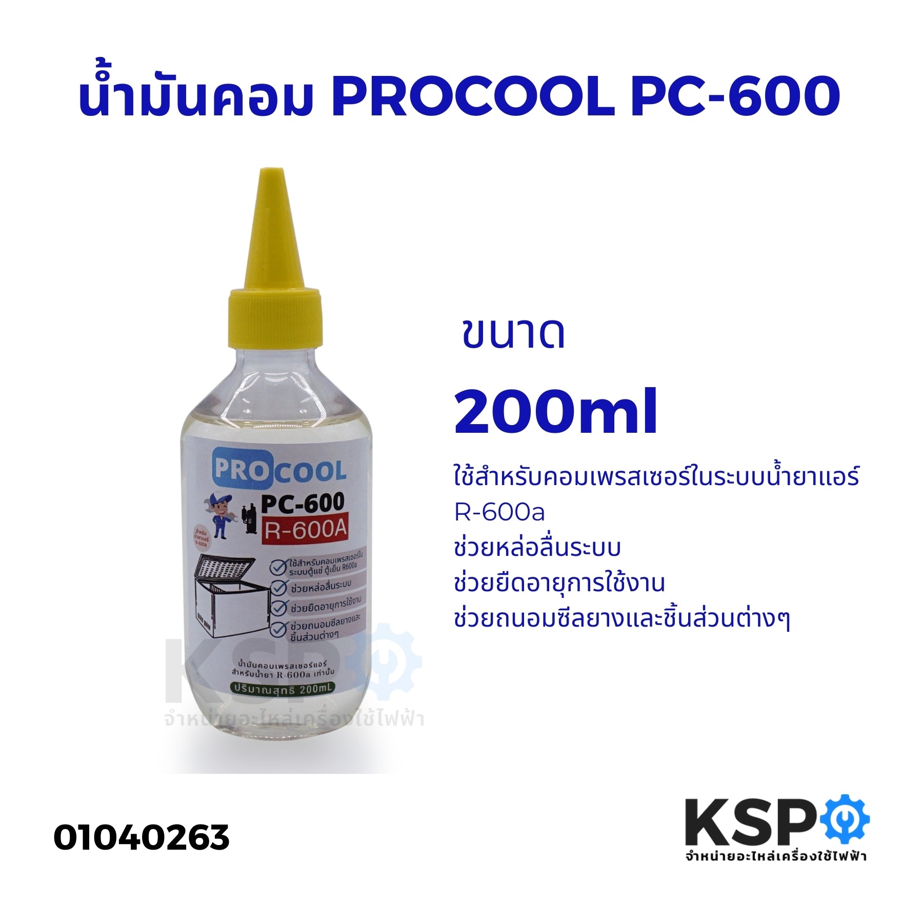 น้ำมันคอมเพรสเซอร์แอร์ PROCOOL PC-600 สำหรับระบบแอร์ R600a อะไหล่ทดแทนที่จำเป็นสำหรับการซ่อมแซมและบำรุงรักษาเครื่องปรับอากาศและตู้เย็นที่ใช้น้ำยา R600a (Isobutane) ช่วยให้คอมเพรสเซอร์ของคุณทำงานได้อย่างมีประสิทธิภาพและยืดอายุการใช้งาน เป็นน้ำมันหล่อลื่นคุณภาพสูงสำหรับระบบแอร์ R600a ลดการสึกหรอของชิ้นส่วนภายในคอมเพรสเซอร์ เหมาะสำหรับตู้เย็นและเครื่องปรับอากาศที่ใช้น้ำยาธรรมชาติ R600a
