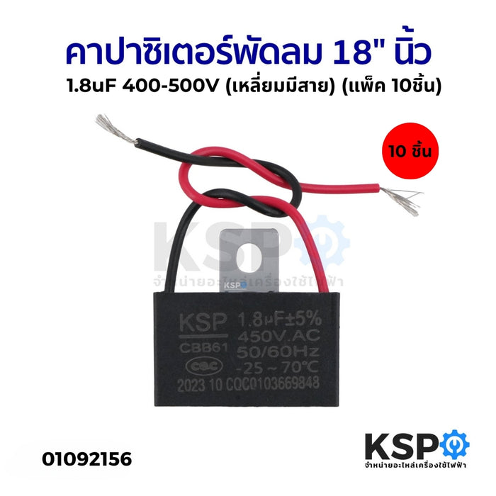 คาปาซิเตอร์พัดลมขนาด 1.8uF 400-500V แบบเหลี่ยมพร้อมสาย เหมาะสำหรับพัดลมขนาด 18 นิ้ว ช่วยให้พัดลมทำงานได้อย่างมีประสิทธิภาพ โดยคาปาซิเตอร์รุ่นนี้จะช่วยเพิ่มพลังให้กับพัดลมของคุณ โดยการให้กำลังไฟฟ้าในรูปแบบที่เสถียรและมีความทนทาน