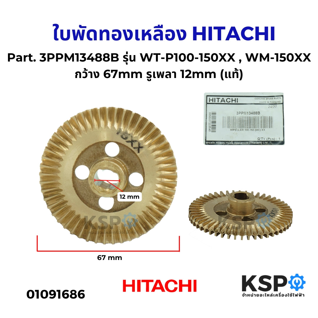 ใบพัดทองเหลือง HITACHI ฮิตาชิ Part. 3PPM13488B รุ่น WT-P100-150XX , WM-150XX กว้าง 67mm รูเพลา 12mm (แท้) อะไหล่ปั๊มน้ำ