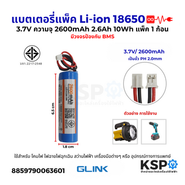 แบตเตอรี่แพ็คลิเธียมไอออน (Li-ion) รุ่น 1P 18650 ความจุ 2600mAh (2.6Ah) 10Wh แรงดันไฟฟ้า 3.7V พร้อมวงจรป้องกัน BMS เพื่อความปลอดภัย เหมาะสำหรับใช้งานกับโคมไฟโซล่าเซลล์, ไฟฉายฉุกเฉิน, สว่านไฟฟ้า, เครื่องมือต่าง ๆ หรืออุปกรณ์ทางการแพทย์ ให้การใช้งานยาวนานและมั่นใจในความปลอดภัย