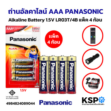 ถ่านอัลคาไลน์ Panasonic ขนาด AAA แรงดัน 1.5 โวลต์ รุ่น LR03T/4B แพ็ค 4 ก้อน ให้พลังงานยาวนาน เหมาะสำหรับอุปกรณ์อิเล็กทรอนิกส์ขนาดเล็กที่ต้องการพลังงานต่อเนื่อง เช่น รีโมทคอนโทรล นาฬิกา เมาส์ไร้สาย และของเล่น