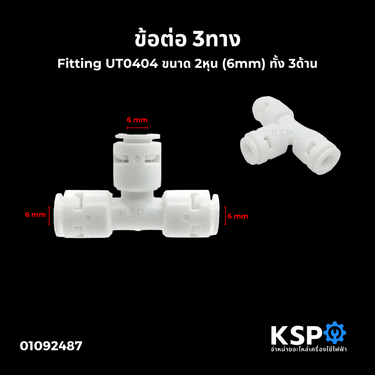ข้อต่อ 3ทาง รูปตัว T สำหรับเครื่องกรองน้ำ รุ่น UT0404 ใช้เชื่อมต่อท่อน้ำขนาด 6mm (2 หุน) ทั้ง 3 ด้าน เหมาะสำหรับการแยกน้ำในระบบกรองน้ำ หรือระบบน้ำดื่มทั่วไป