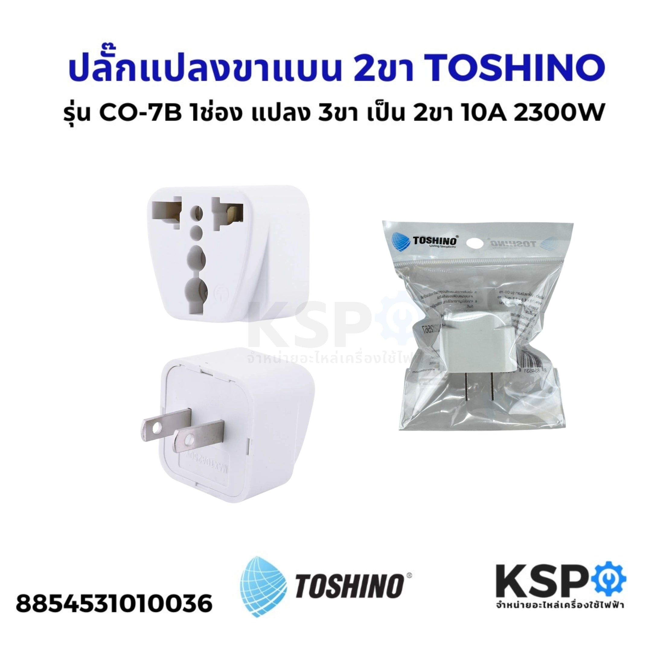 ปลั๊กแปลงขาแบน 2 ขา TOSHINO รุ่น CO-7B ออกแบบมาเพื่อแปลงจาก 3 ขาเป็น 2 ขาแบน ซึ่งเหมาะสำหรับการใช้งานในประเทศที่มีปลั๊กไฟ 3 ขาและต้องการใช้งานกับอุปกรณ์ที่ใช้ปลั๊ก 2 ขาแบน มีความทนทาน รองรับกำลังไฟฟ้าได้ถึง 2300 วัตต์และกระแสไฟสูงสุดที่ 10A ออกแบบให้มีขนาดเล็ก พกพาสะดวก เหมาะสำหรับการเดินทางไปต่างประเทศและใช้งานกับอุปกรณ์ต่างๆ