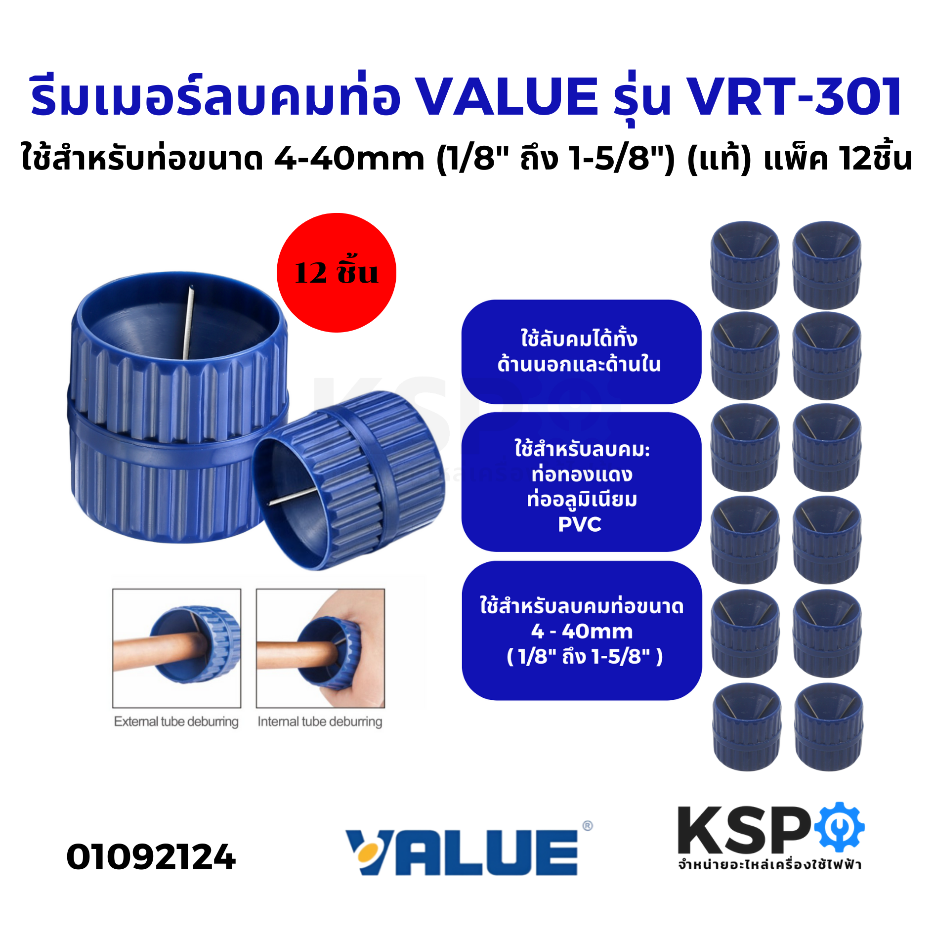 รีมเมอร์ลบคมท่อ VALUE รุ่น VRT-301 ใช้สำหรับท่อขนาด 4-40mm (1/8" ถึง 1-5/8") แบบกลม รีมเมอร์ลบคมแป๊ป (แท้) แพ็ค 12ชิ้น เครื่องมือช่างแอร์